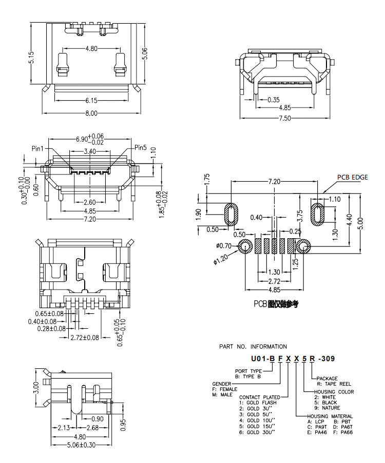 5P Micro USB Connector Short Pin Micro USB Female B Type Charging Port Connector Product Item:U01-BFXX5R-309 Housing:High Temperature Thermoplastic with g.f,UL94V-O Contact:Copper Alloy Current Rating:1.8A Dielectric Withstanding Voltage:100 V R.M.S. Micro USB Connector Short Pin Micro USB Female 5P B Type Connector Inquiry Send Email Datasheet