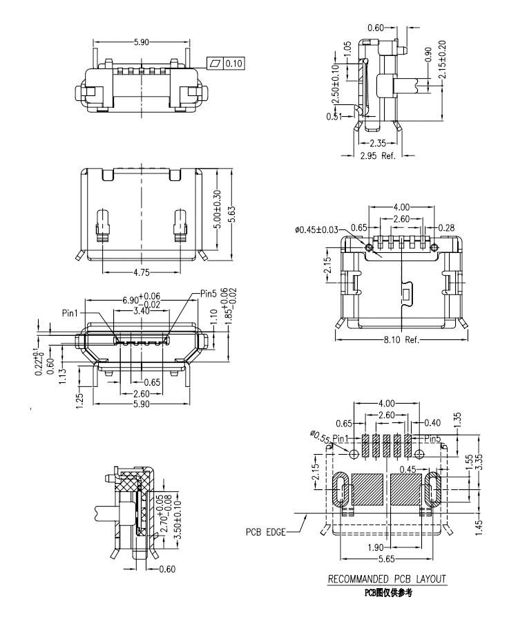 5Pin PCB Mount Micro USB Type B Micro USB 2.0 B Type Female Solder Connector Product Item:U01-BFXX5R-703 Housing:High Temperature Thermoplastic with g.f,UL94V-O Contact:Copper Alloy Current Rating:1.8A Dielectric Withstanding Voltage:100 V R.M.S. 5Pin Micro USB Type B Charging Port Micro USB 20 B Type Female Solder Connector Inquiry Send Email Datasheet