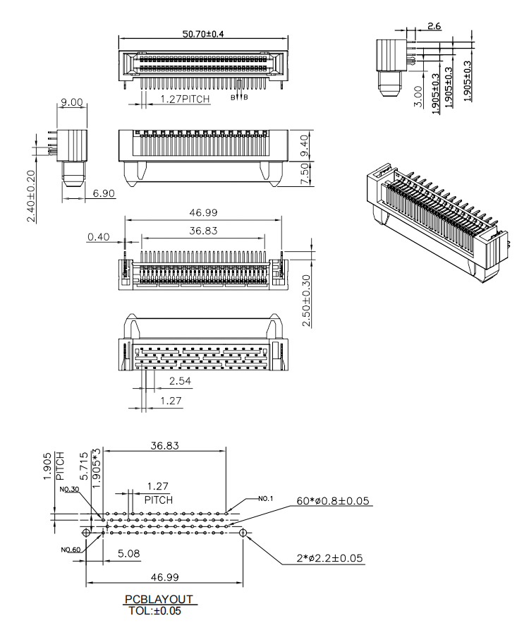 60Pin OPS Female Header Connector PBT Black PCB Board to Board Connector Product Item:OPS-XFXX5T-003 Housing:PBT UL 94V-0 Black Contact:C5191-H, T=0.3mm Current Rating:1.0A Dielectric Withstanding Voltage:500V AC/rms 60Pin OPS Female Header Connector 127MM Pitch PBT Black PCB Board to Board Connector Inquiry Send Email Datasheet