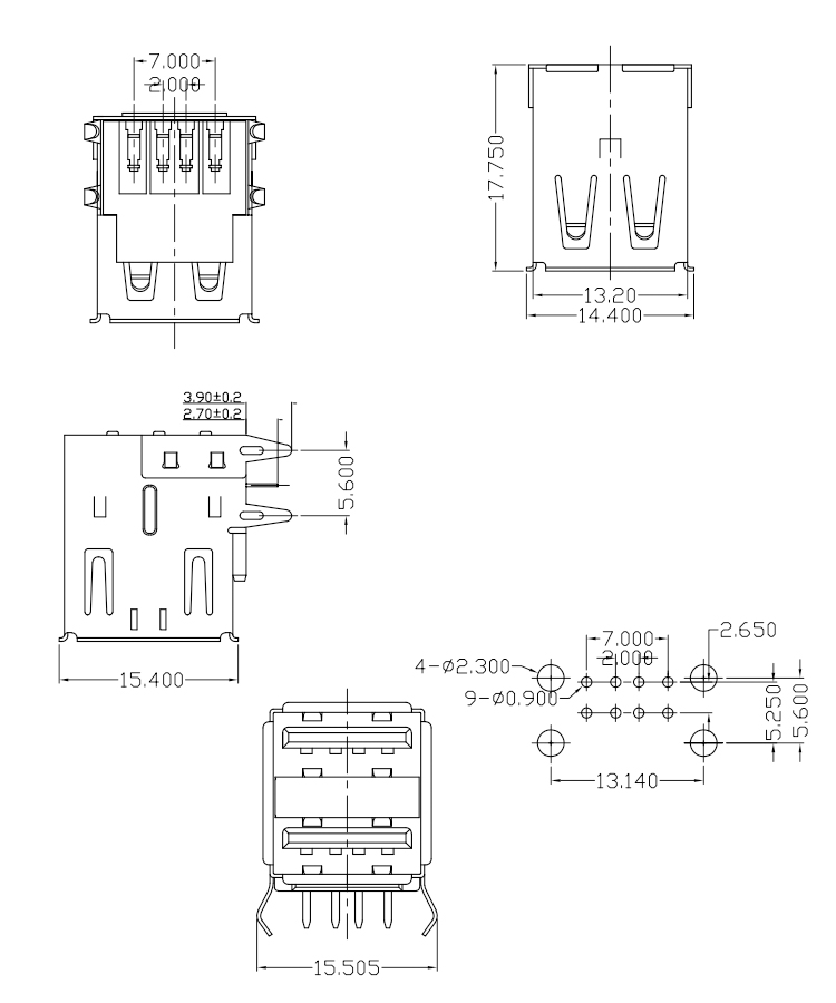 8Pin Through Hole 90Degree Dual USB 2.0 A Type Female Socket Connector Product Item:DU06-AFXXXT-001 Housing:High Temperature Plastic,UL94V-O Contact:Brass Current Rating:1.5A Dielectric Withstanding Voltage:500V AC/rms 8Pin Right Angle Dual USB 20 A Female Dip Type Connector Inquiry Send Email Datasheet