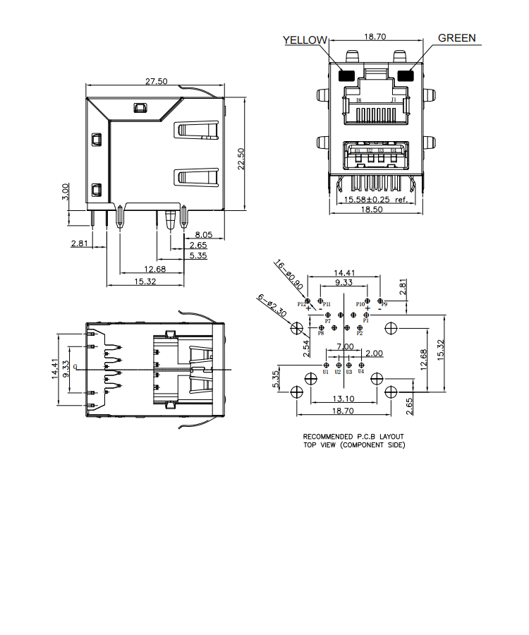 90Degree with Leds RJ45 +Single 4Pin USB 2.0 Female Connector Product Item:RJU2001-X50X-004 Housing: Thermo plastics,P B T ,BLA C K,UL94V-0 Insert Base : Thermo plastics.P B T.B K.UL94V-0 Current Rating:1.5A Shell: Alloy.Nickel plating overall. 90Degree with Leds RJ45 +Single USB 20 Female Connector Inquiry Send Email Datasheet