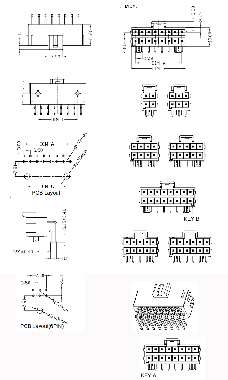 Custom 4~16P 3.5mm Right Angle Dual Row Header Connector 2x4 Pin PCB Wire to Board Connector Product Item:H350014-XX-X Material:LCP UL94V-O,Black/Natural Pin Material:High Conductivity Copper Alloy Tin Plated Current Rating:14A at 16A Dielectric Withstanding Voltage:1800V AC/Minute Custom 416Pin 35mm Right Angle Dual Row Header 2x4 Pin PCB Wire to Board Connector Inquiry Send Email Datasheet