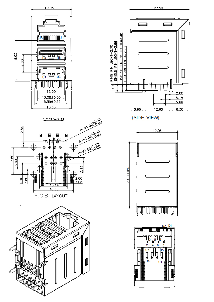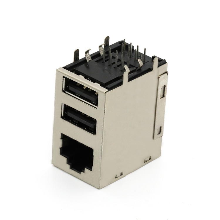 DIP Type 90Degree RJ45+Dual USB 2.0 Female Connector Product Item:RJ01-X52X-064 Housing:High temp. Thermo plastics,UL94V-0 Gender:Female Current Rating:1.5A Color:Black Through Hole 90Degree RJ45+Dual USB 20 Female Connector Inquiry Send Email Datasheet