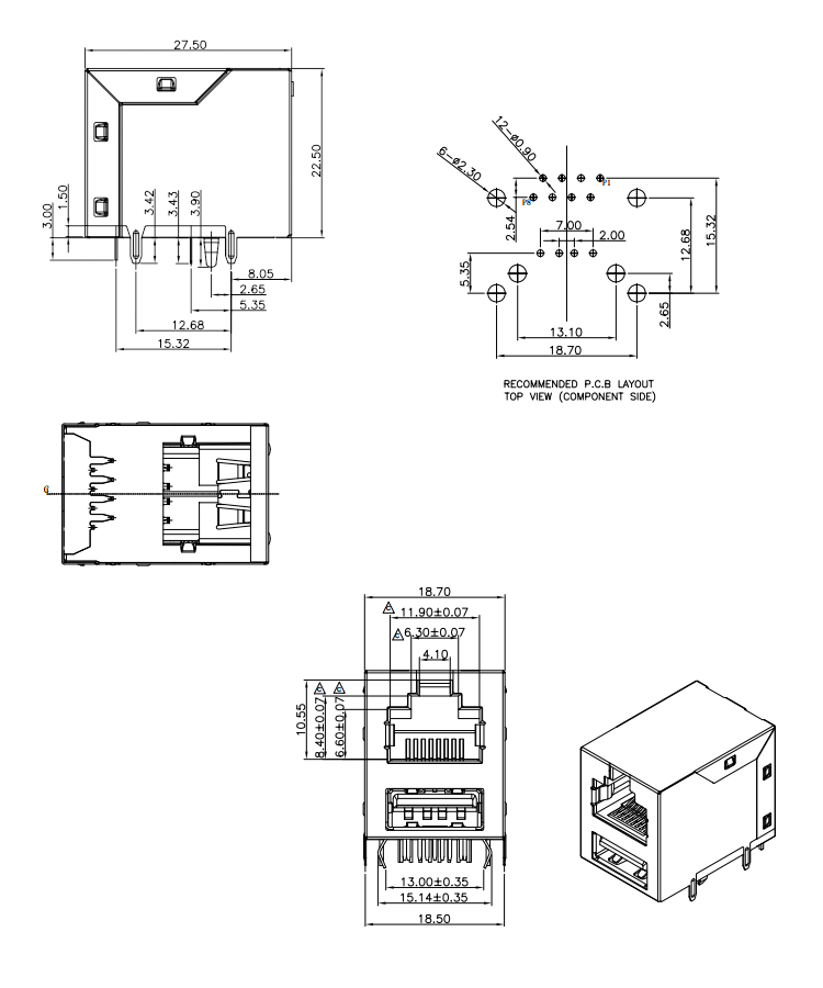 Dip Type 90Degree without Leds RJ45 with Single USB 2.0 Female Connector Product Item:U20RJ01-X50X-011 .Housing: Thermo plastics,PBT ,BK,UL94V-0 Contact: Phosphor Copper Current Rating:1.5A Shell: Alloy 90Degree without Leds RJ45 with Single USB 20 Female Connector Inquiry Send Email Datasheet