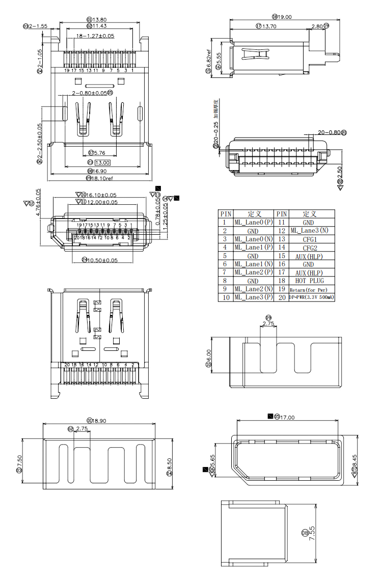 DisplayPort 20Pin Female Connector For Wire Soldering With Cover Product Item:DP09-FXX5B-004 Housing:LCP+30%G/F,UL 94V-0 Contact:C2680-H T=0.20mm Current Rating:1.5A Dielectric Withstanding Voltage:100 V R.M.S. DP Female Connector DisplayPort 20Pin Female Connector With Cover Inquiry Send Email Datasheet