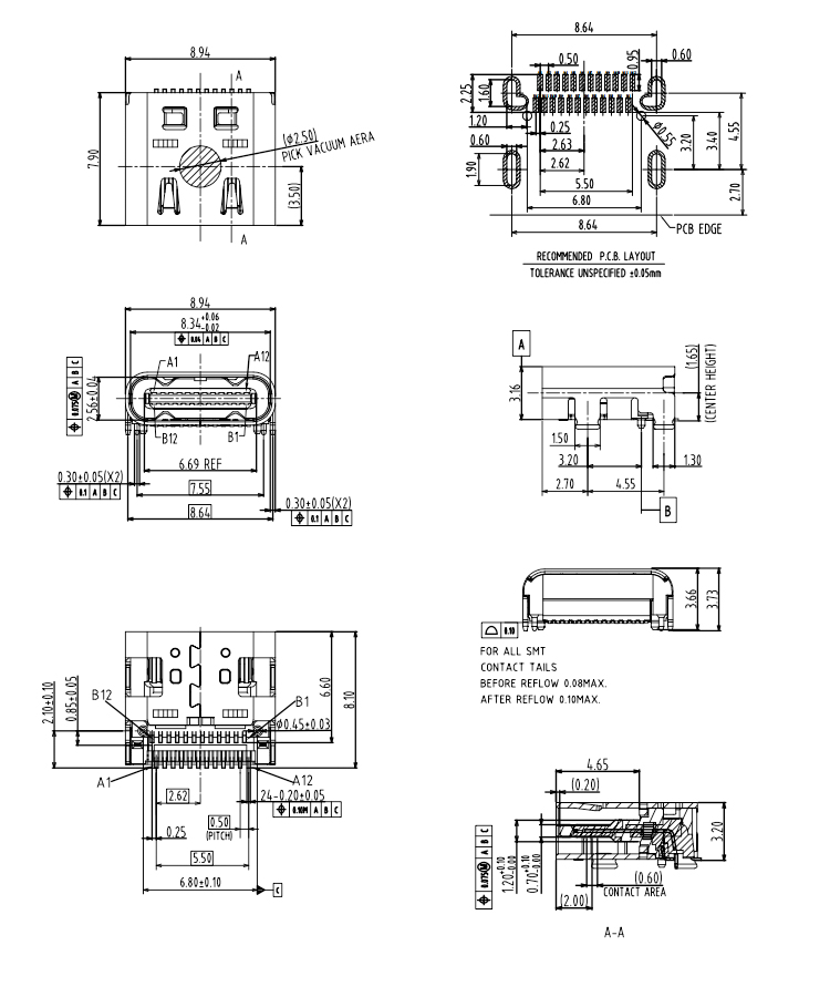 Dual SMT L=7.9MM USB Type C 24P Female Socket Connector Product Item:U06-CFXX5X-068 Housing:High Temperature Plastic,UL94V-O Contact:Copper Alloy Current Rating:5A Dielectric Withstanding Voltage:100 V R.M.S. Top Mount Dual SMT USB Type C 24P Female Socket Connector Inquiry Send Email Datasheet