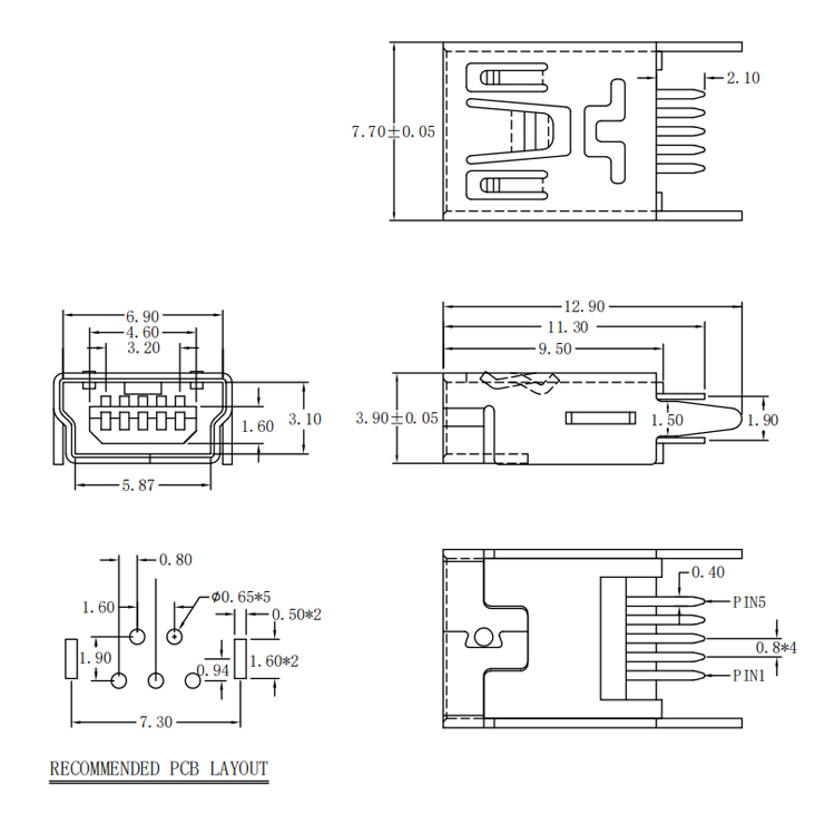 MINI USB 5 pin Female connector DIP Type Product Item:U05-BFXX5X-003 Gender: Female Pin number: 5Pin Color: Black Insulator: LCP mini usb 5 pin female connector Inquiry Send Email Datasheet