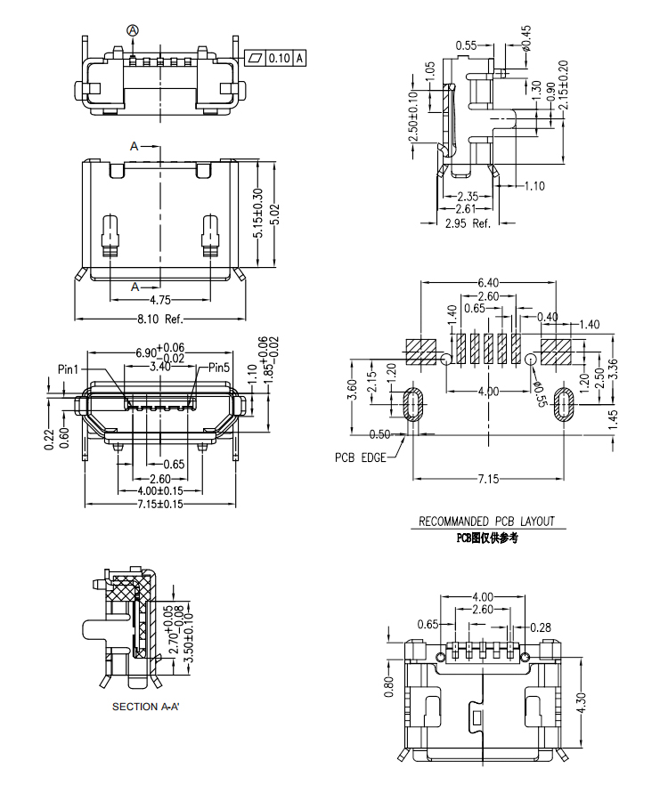 Micro USB 5 Pin B Type Female Connector Micro USB Female Dip Charging Connector Product Item:U01-BFXX5R-705 Housing:High Temperature Thermoplastic with g.f,UL94V-O Contact:Copper Alloy Current Rating:1.8A Dielectric Withstanding Voltage:100 V R.M.S. Micro USB 5 Pin B Type Female Connector Micro USB 20 Female Charging Connector Inquiry Send Email Datasheet