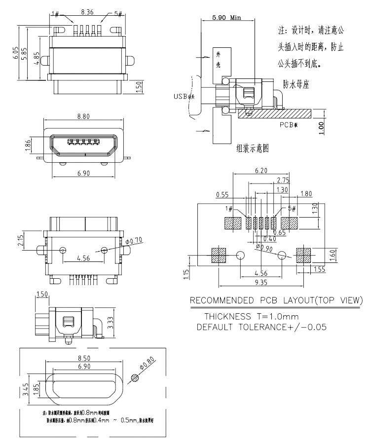 Micro USB Connector IP68 Waterproof Micro USB 2.0 B 5Pin Female Connector Product Item:U01-BFXX5R-W034 Housing:PA10T(30%G.F) Contact: Phosphor Bronze Current Rating:3A Dielectric Withstanding Voltage:500V AC/rms 180Degree SMT IP68 Waterproof Micro USB 20 B Type 5Pin Female Connector Inquiry Send Email Datasheet