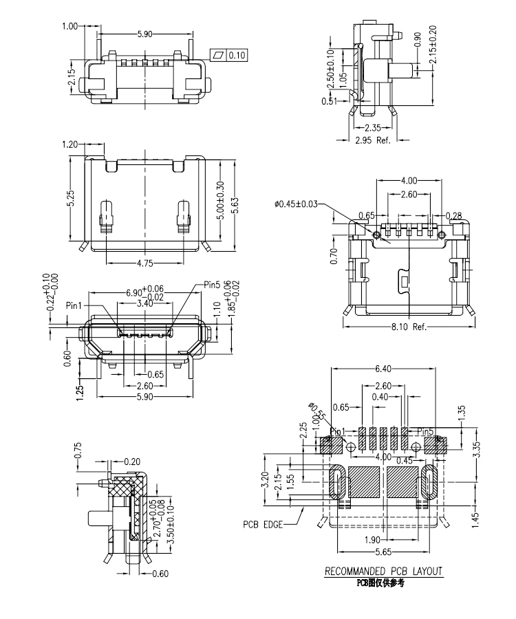 Micro USB PCB Connector SMT 5Pin Micro USB B Type Female Connector Product Item:U01-BFXX5R-710 Housing:High Temperature Thermoplastic with g.f,UL94V-O Contact:Copper Alloy Current Rating:1.8A Dielectric Withstanding Voltage:100 V R.M.S. Micro USB PCB Connector SMT 5Pin Micro USB B Type Female Solder Connector Inquiry Send Email Datasheet