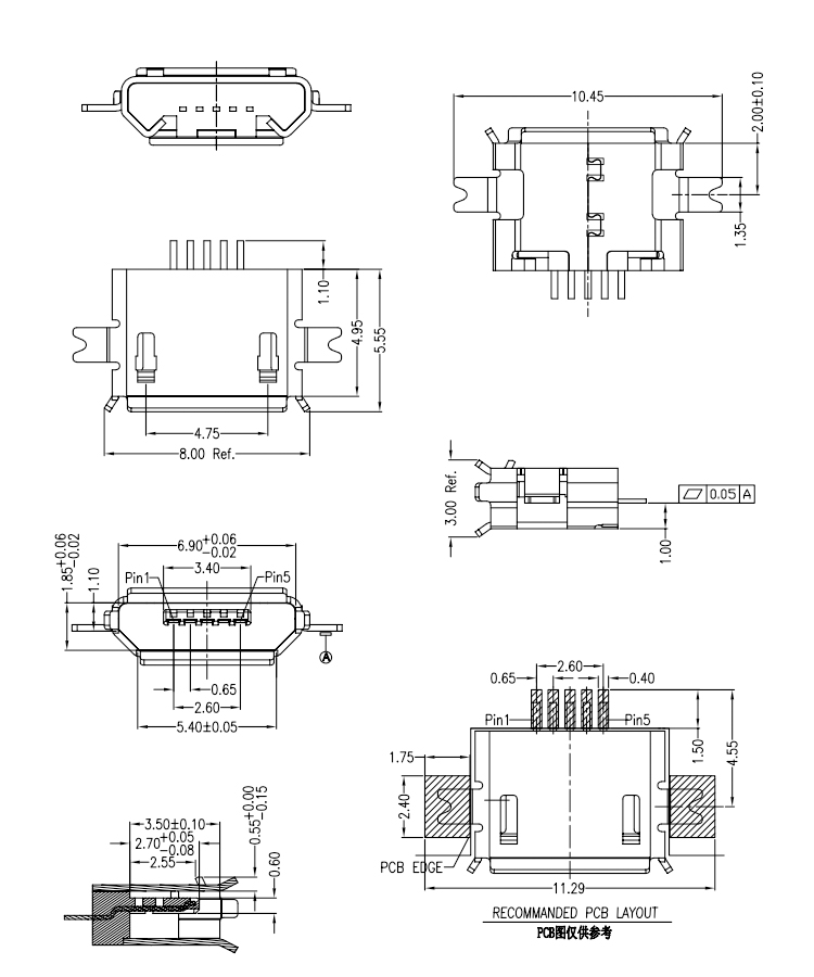Mid Mount 1.0mm 5Pin Micro USB 2.0 B Type Female Charging Socket Connector Product Item:U01-BFXX5R-510 Housing:High Temperature Thermoplastic with g.f,UL94V-O Contact:Copper Alloy Current Rating:1.8A Dielectric Withstanding Voltage:100 V R.M.S. Mid Mount 10mm 5Pin Micro USB 20 B Type Female Connector Inquiry Send Email Datasheet