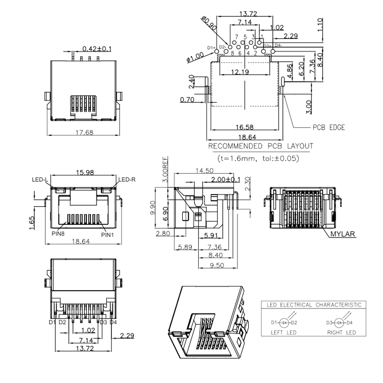 Mid Mount 3.0mm RJ45 8P8C Female Socket Ethernet Connector with Led Light Product Item:RJ01-X5XX-030-X Housing:LCP UL94V-0,Black Contact:Copper Alloy Current Rating:1.5A Dielectric Withstanding Voltage:125 V R.M.S. Mid Mount Through Hole RJ45 8P8C Female Socket Ethernet Connector with Led Light Inquiry Send Email Datasheet