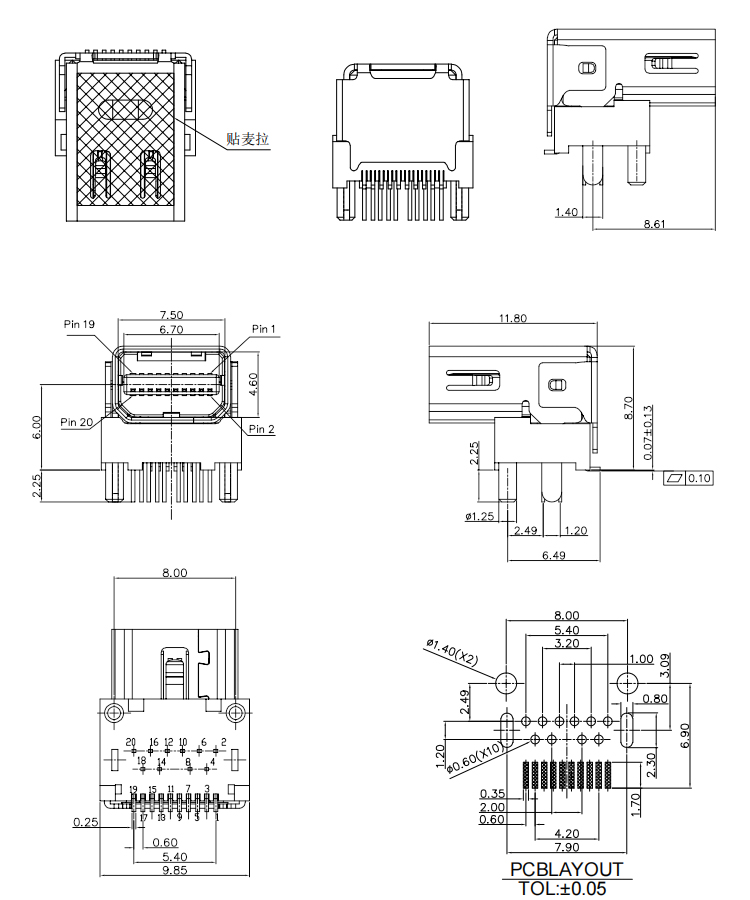 Mini DP Female Connector 20Pin 90Degree Mini DisplayPort DIP SMT Female Connector Product Item:MDP09-FXX5X-005 Housing:LCP+30%G.F UL 94V-0 Black Contact:Copper Alloy Current Rating:0.5A Dielectric Withstanding Voltage:500V AC/rms Mini DP Female Connector 20Pin 90Degree Mini DisplayPort DIP SMT Connector Inquiry Send Email Datasheet