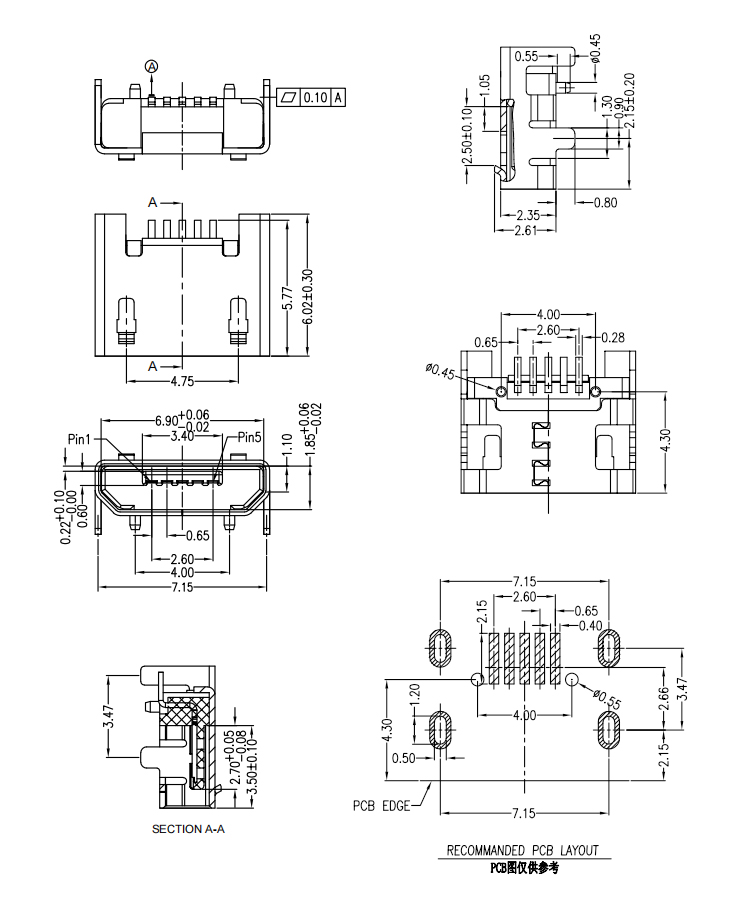 PCB Mount Micro USB Connector with Locking Pin Micro USB 5Pin B Type Female Connector Product Item:U01-BFXX5R-718 Housing:High Temperature Thermoplastic with g.f,UL94V-O Contact:Copper Alloy Current Rating:1.8A Dielectric Withstanding Voltage:100 V R.M.S. PCB Mount Micro USB Connector Micro USB 5Pin B Type Female Charging Port Connector Inquiry Send Email Datasheet