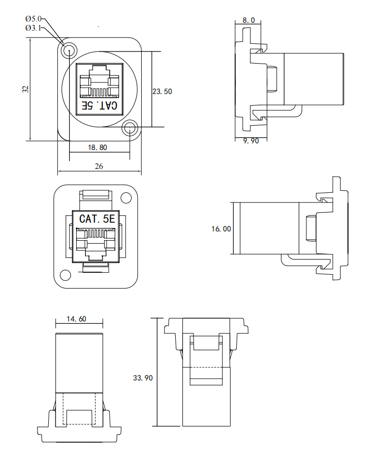 Panel Mount Dual Port RJ45 CAT.5E Ethernet Connector RJ45 Keystone Adapter Product Item:SC-S-5866-CAT-5E-34MM Housing:ABS ROHS Contact:Carobronze Contact Resistance:2.5M ohms Max Pressure Resistance:DC700V 1 Min Panel Mount Dual Port RJ45 CAT5E Semi-conductive Ethernet Connector RJ45 Keystone Adapter Inquiry Send Email Datasheet