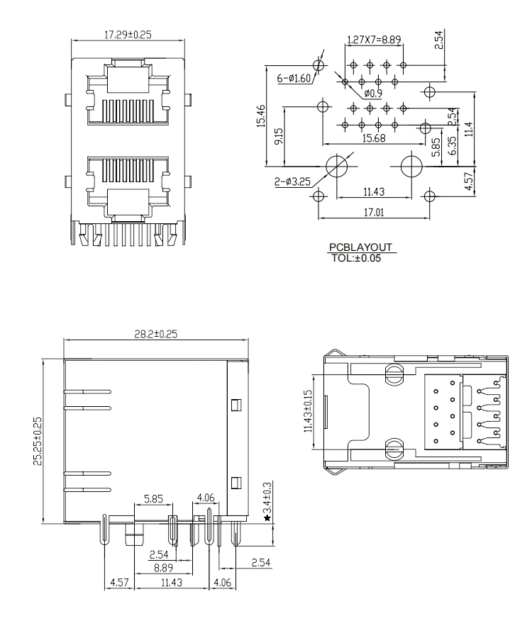 RJ45 Connector DIP Type 8P8C 2X1 Dual Port RJ45 Female Connector Product Item:RJ01-X50X-098 Housing: PBT BLACK UL94V-0 Gender:Female Current Rating:1.5A Dielectric Withstanding Voltage:500V AC/rms RJ45 Connector DIP Type 16Pin 8P8C 2X1 Dual Port RJ45 Female Connector Inquiry Send Email Datasheet