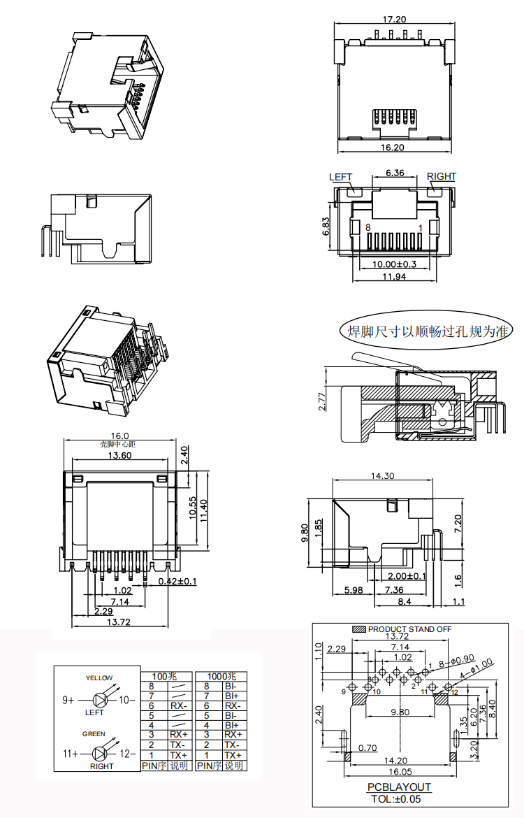 RJ45 Female Connector 9.8H Mid-mount 7.2mm Dip Type RJ45 Modular Jack Network Data Transmission Socket Connector Product Item:RJ01-X1BX-139 Housing:Thermo Plastic UL94V-2. Contact:Phosphor Bronze T=0.25mm Current Rating:1.5A Dielectric Withstanding Voltage:500 V R.M.S. RJ45 Female Connector 98H Mid-mount 72mm Dip Type RJ45 Modular Jack Network Data Transmission Socket Connector Inquiry Send Email Datasheet