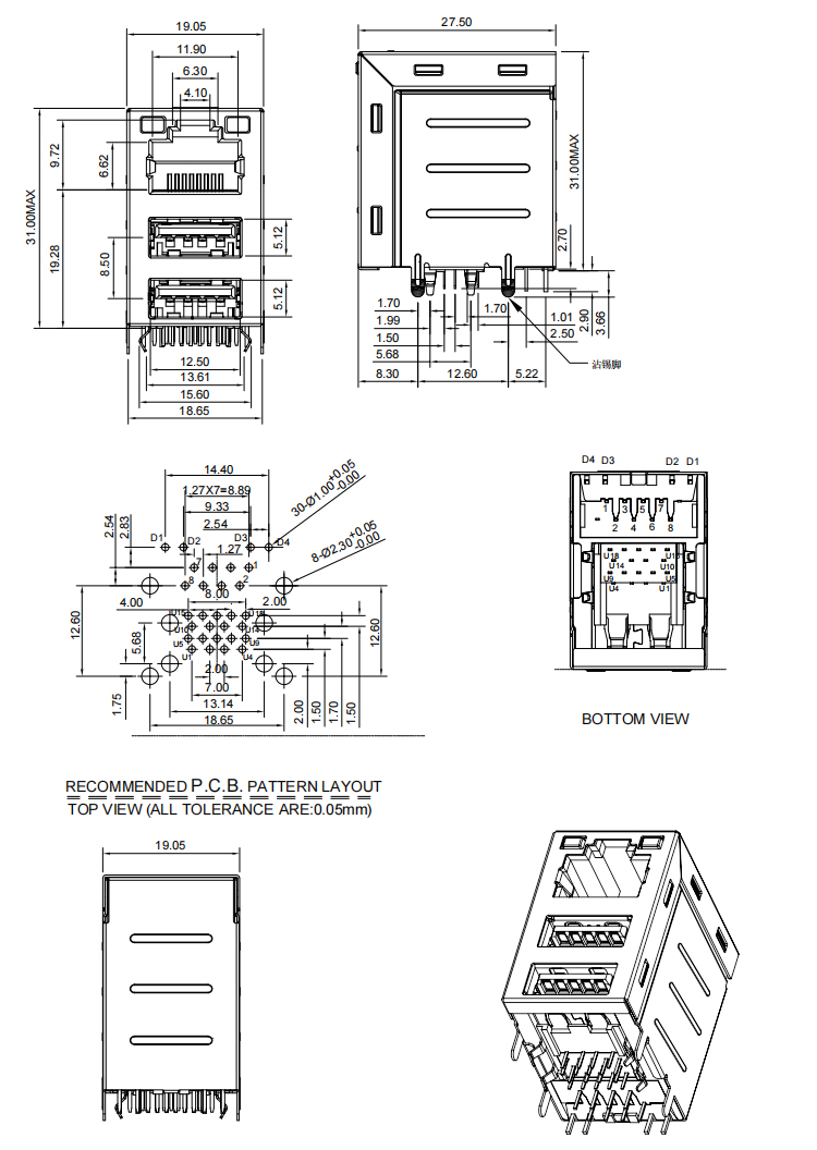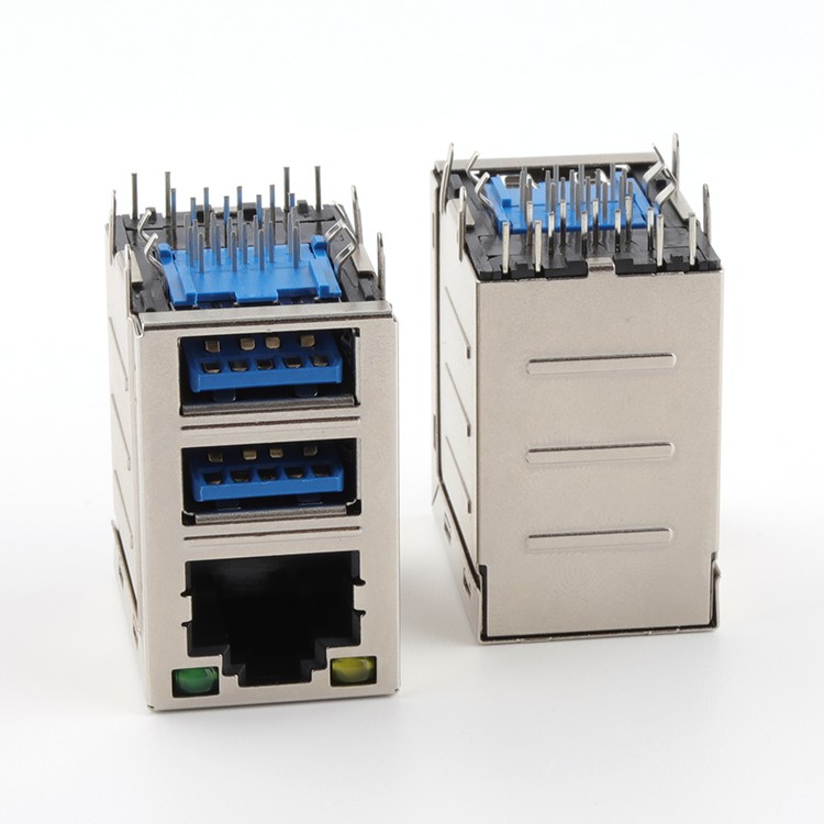 RJ45+Dual USB 3.0 Type A Female Connector Product Item:RJY3001-X50X-002 Housing: High temp. Thermo plastics,UL94V-0. Contact:Copper Alloy Current Rating:1.5A Shell:SUS RJ45+Dual USB 30 Type A Female Connector with Leds Inquiry Send Email Datasheet