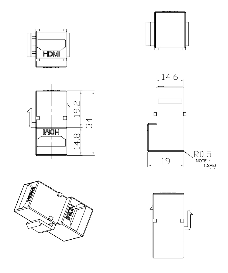 Right Angle High Definition Multimedia Interface 19Pin A Female to A Female Adapter Product Item:ADHD19AFTO10AF-002 Contact Resistance: 10M Ohms Max Insulation Resistance: 100M Ohms Min Current Rating:0.5A Dielectric Withstanding Voltage:500V AC/rms 90 Degree High Definition Multimedia Interface 19Pin A Female to A Female Adapter Converter Inquiry Send Email Datasheet
