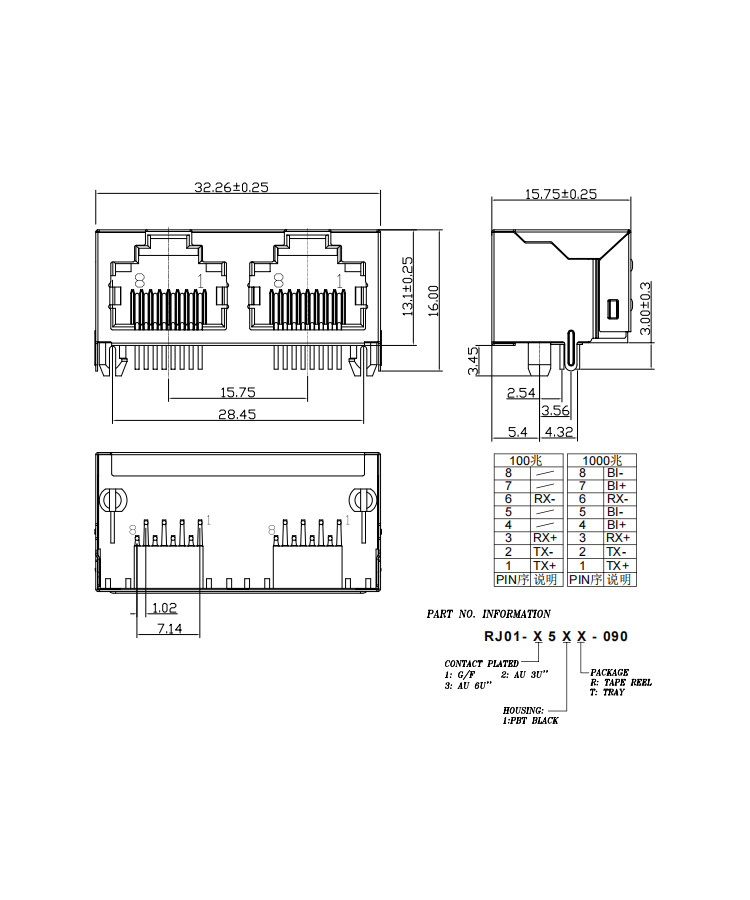 Right Angle Through Hole 1X2 Port 16Pin 8P8C Ethernet Jack RJ45 Female Connector Product Item:RJ01-X5XX-090 Housing:Thermo Plastic UL94V-0 Gender:Female Current Rating:1.5A Dielectric Withstanding Voltage:500V AC/rms Right Angle Through Hole 1X2 Port 8P8C Ethernet Jack RJ45 Female Connector Inquiry Send Email Datasheet