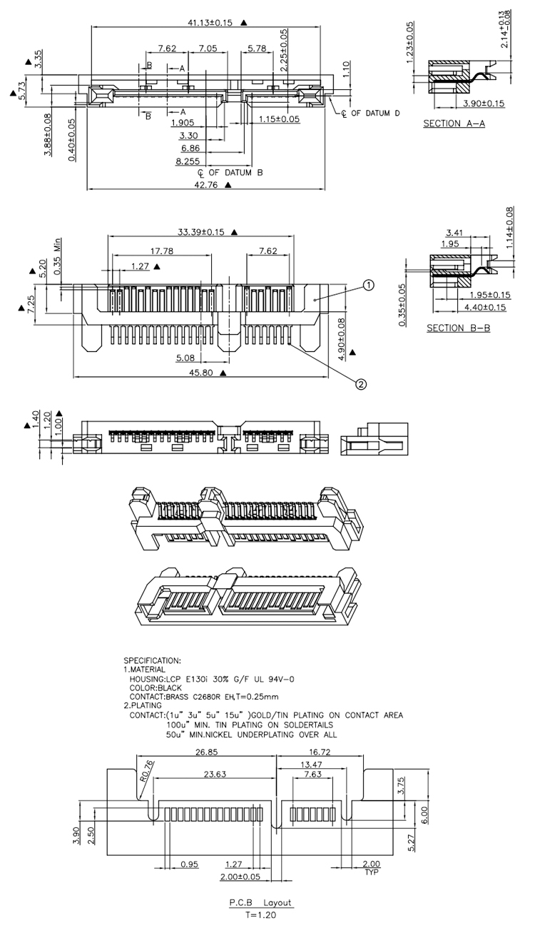 SATA Male Connector SATA 7+15Pin Male Connector for1.2MM PCB Product Item:S715-MXA5T-006-V2 Housing:LCP UL94V-0 Contact:Brass Current Rating:1.5A Dielectric Withstanding Voltage:100 V R.M.S. SATA 7+15Pin Male Connector SATA Male Connector for12MM PCB Inquiry Send Email Datasheet