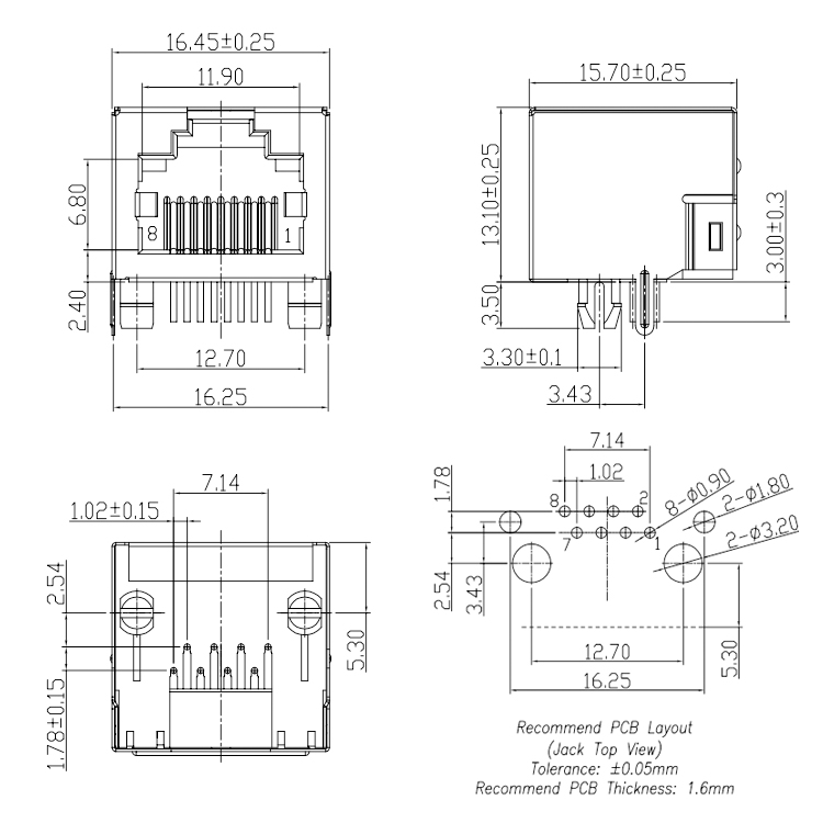 Single Port 8P8C RJ45 Female Socket Connector PCB Mount R/A Product Item:RJ01-X5XX-011 Gender:Female Pin Number: 8Pin Color:Black Insulator:LCP Single Port 8P8C RJ45 Female Socket Connector PCB Mount Inquiry Send Email Datasheet