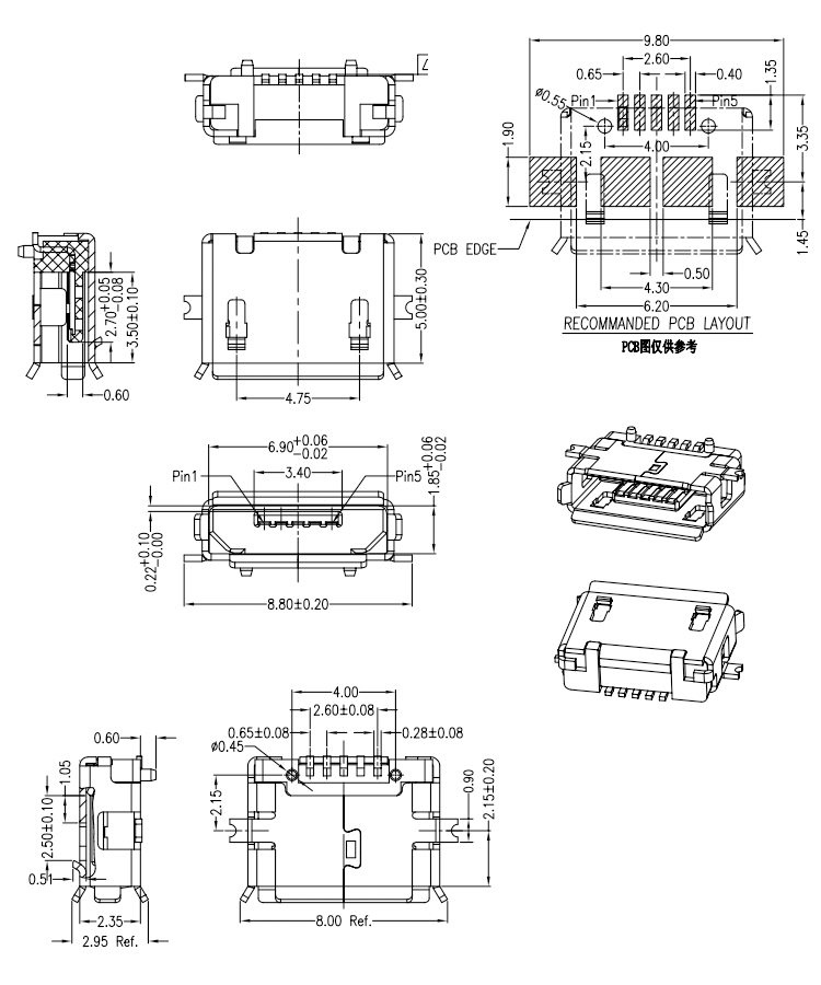 Surface Mount with Locking Pins 5P Micro USB 2.0 B Type Female Socket Connector Product Item:U01-BFXX5R-905 Housing:High Temperature Thermoplastic with g.f,UL94V-O Contact:Copper Alloy Current Rating:1.8A Dielectric Withstanding Voltage:100 V R.M.S. Surface Mount 5P Micro USB 20 B Type Female Socket Connector Inquiry Send Email Datasheet