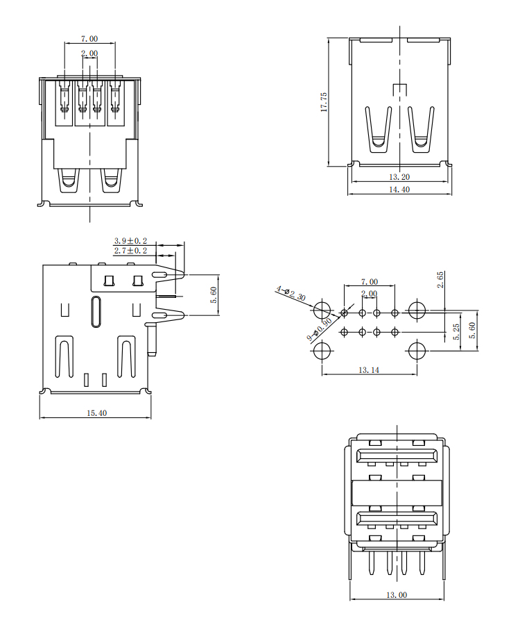 Through Hole Right Angle 8Pin USB 2.0 Type A Female Socket Connector Product Item:DU06-AFXXXT-004 Housing:High Temperature Plastic UL94V-O Contact:Brass Current Rating:1.5A Dielectric Withstanding Voltage:500V AC/rms Through Hole 90Degree USB 20 Type A 8Pin Female Socket Connector Inquiry Send Email Datasheet