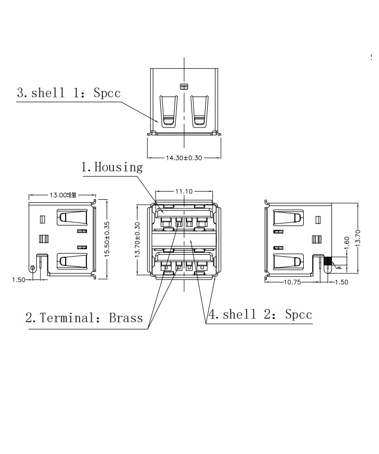 USB 2.0 A Female Connector Dual Row Right Angle USB A Type 4Pin Connector Product Item:U02-D5AFXXXT-001 Housing:High Temperature Plastic UL94V-O Contact:Copper Alloy C2680 Current Rating:1.5A Dielectric Withstanding Voltage:500V AC/rms USB 20 A Female Connector Dual Row 90Degree USB A Type 4Pin Connector Inquiry Send Email Datasheet