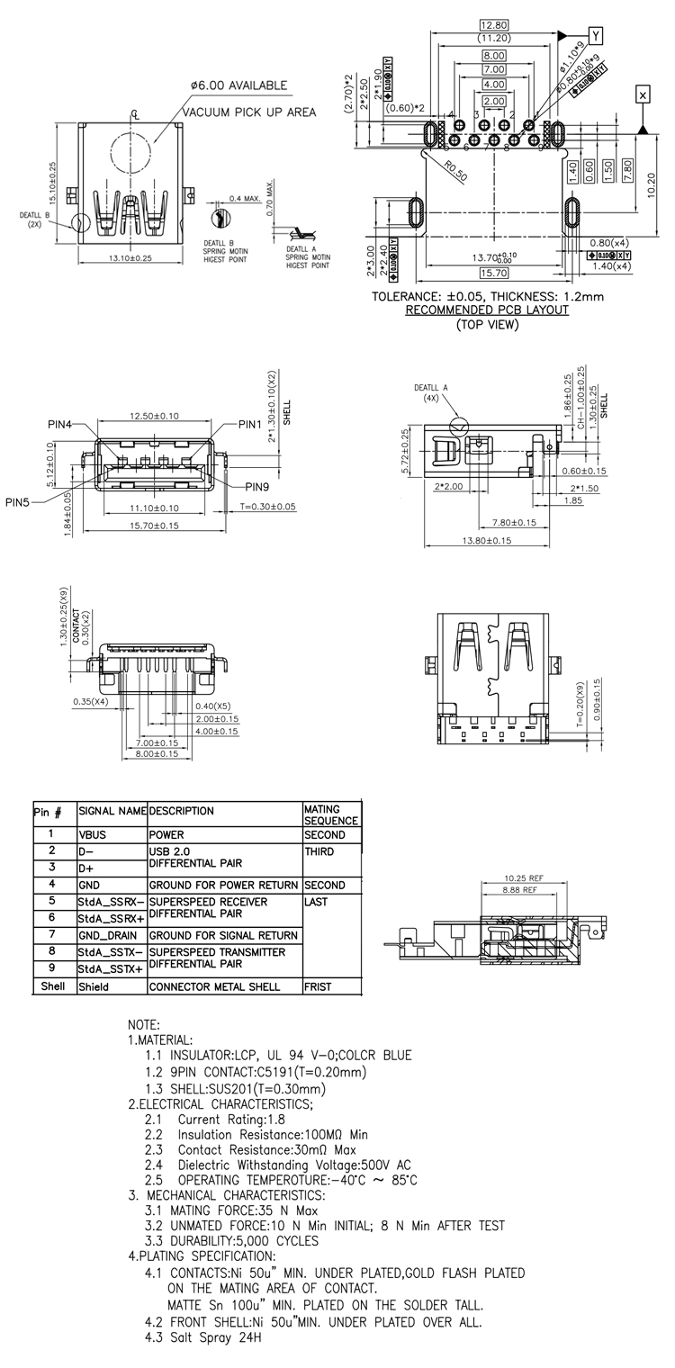 USB 3.0A type Female connector 9P 5.72mm height Product Item:U03-AFXAXX-5006 Gender: Female Pin number: 9Pin Color: Black Insulator: LCP USB 30A type Female connector 9P 572mm height Inquiry Send Email Datasheet