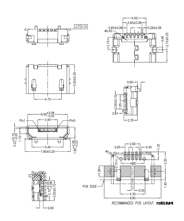 USB Connector Vertical SMT Type 5Pin Micro USB 2.0 B Female Connector Product Item:U01-BFXX5R-607 Housing:High Temperature Thermoplastic with g.f,UL94V-O Contact:Copper Alloy Current Rating:1.8A Dielectric Withstanding Voltage:100 V R.M.S. USB Connector Vertical SMT Type Micro USB 20 5Pin B Female Connector Inquiry Send Email Datasheet