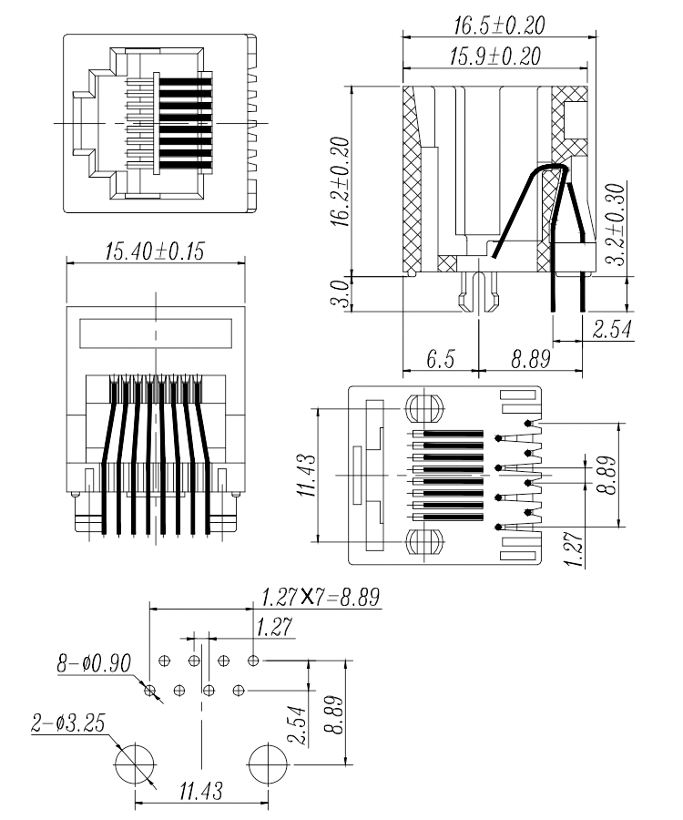 Vertical 180Degree DIP Type RJ45 8P8C Female Connector Product Item:RJ01-X52X-057 Housing: PBT UL94V-0 Gender:Female Current Rating:1.5A Color:Black Vertical 180Degree DIP Type 1X1 Port RJ45 8P8C Female Connector Inquiry Send Email Datasheet