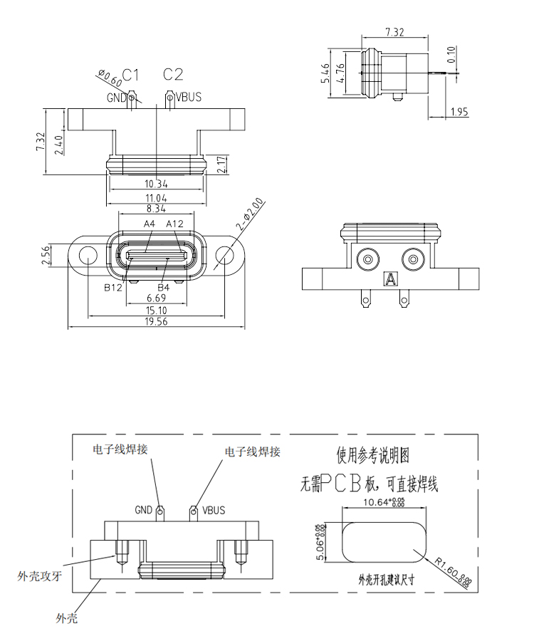 Vertical 2Pin Waterproof USB C Type Female PCB Connector For Wire Soldering Product Item:U06-CFXX5R-W116 Housing:PA9T(30%G.F) Contact: Phosphor Bronze Current Rating:3A Dielectric Withstanding Voltage:100 V R.M.S. 180Degree Waterproof USB C Type 2P Female PCB Connector For Wire Soldering Inquiry Send Email Datasheet