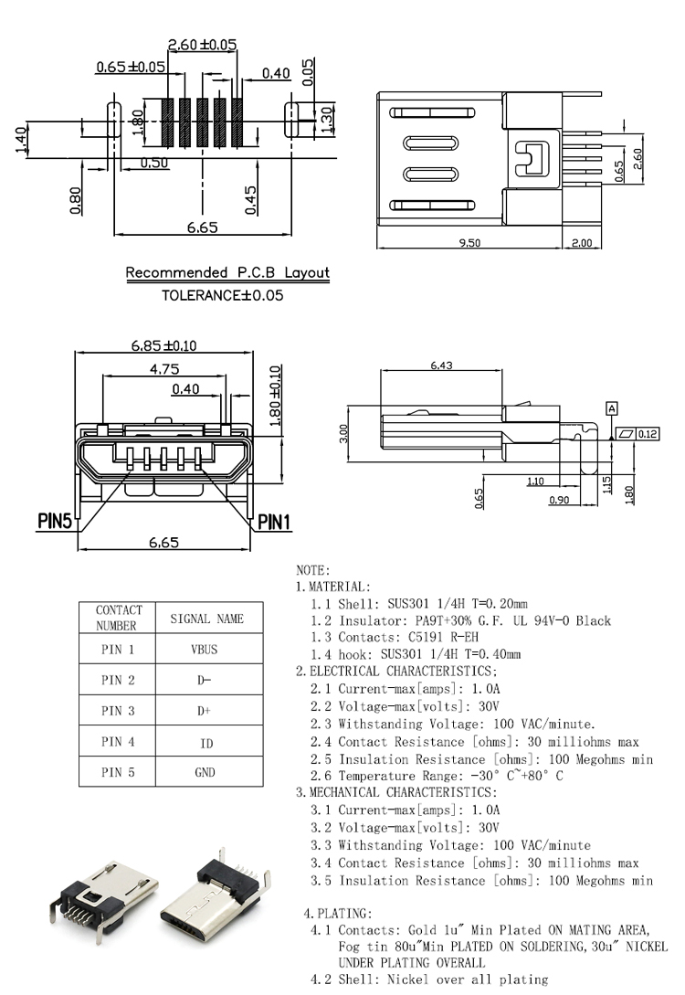 Vertical 5P Surface Mount Micro USB 2.0 Male Connector Product Item:U01-BMXX5R-1301 Housing:LCP+30% G.F. UL 94V-0 Black Contact:C5191 R-EH Shell:SUS301 1/4H T=0.20mm Current Rating:1A Vertical Surface Mount 5P Micro USB 20 Male Connector Inquiry Send Email Datasheet