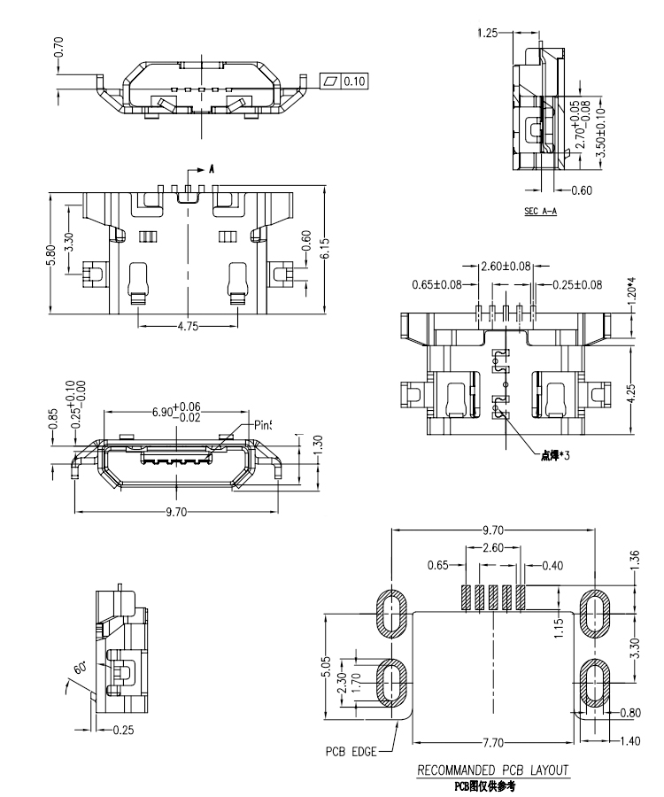 Vertical Mid Mount Smt Micro USB Female 5Pin B Type Charger Connector Product Item:U01-BFXX5R-518 Housing:High Temperature Thermoplastic with g.f,UL94V-O Contact:Copper Alloy Current Rating:1.8A Dielectric Withstanding Voltage:100 V R.M.S. Vertical Mid Mount 5Pin Smt Micro USB Female B Type Connector Inquiry Send Email Datasheet