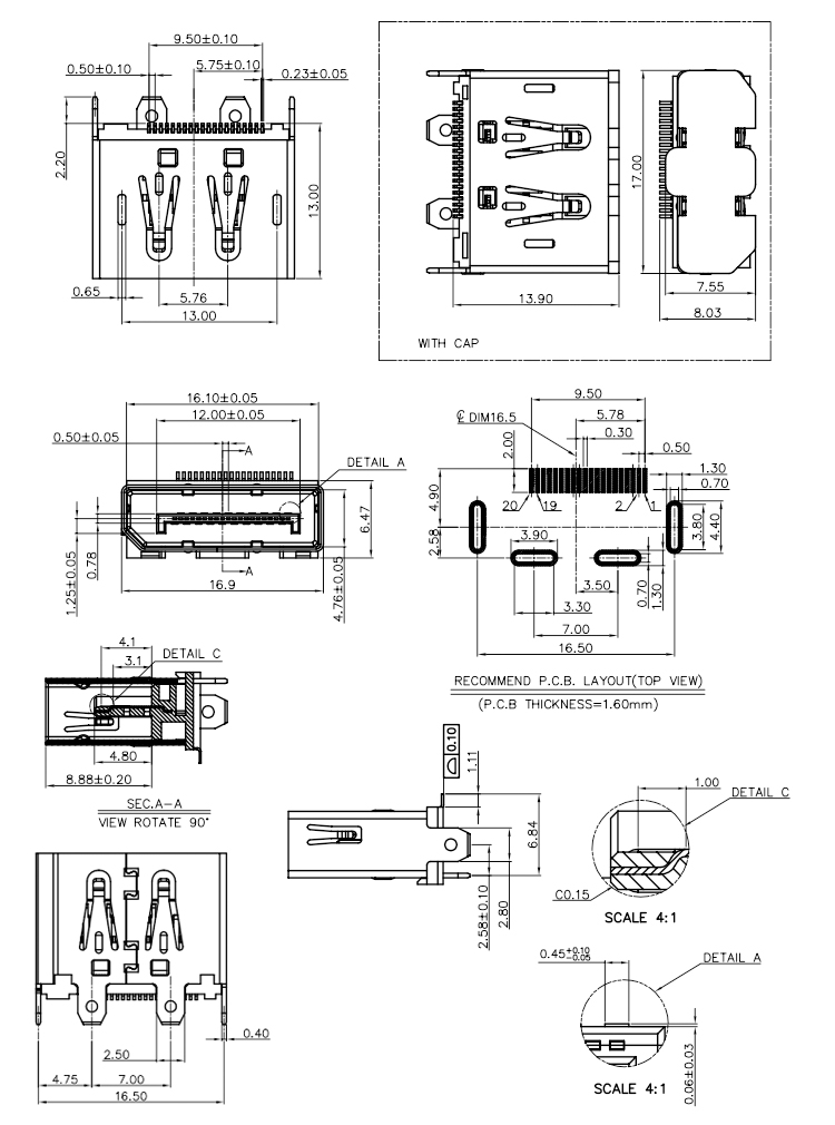 Vertical SMT Type H=13MM,20Pin Display Port Female Receptacle Connector Product Item:DP09-FXX5R-011-VX Insulator:Thermoplastic Gender:Female Pins:20Pin Color:Black Vertical SMT Type 20Pin Display Port Female Receptacle Connector Inquiry Send Email Datasheet